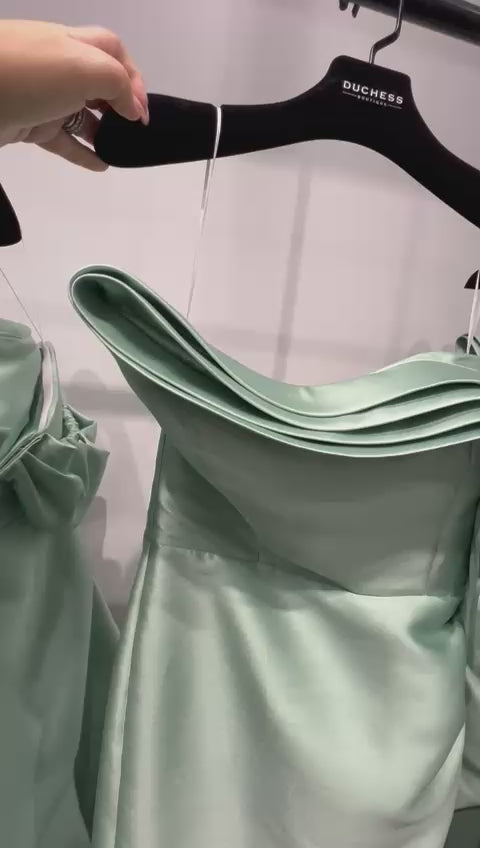 Regular price $799.00Timeless and elegant luxe silhouette made of stretch Mikado fabric. This piece features strapless yet supportive neckline with a fold over design. The back reveals a midrise style with a zipper closure. Semi peplum drape at the hips as a bow ascents the high slit that breaks its mermaid silhouette and train.