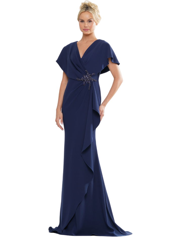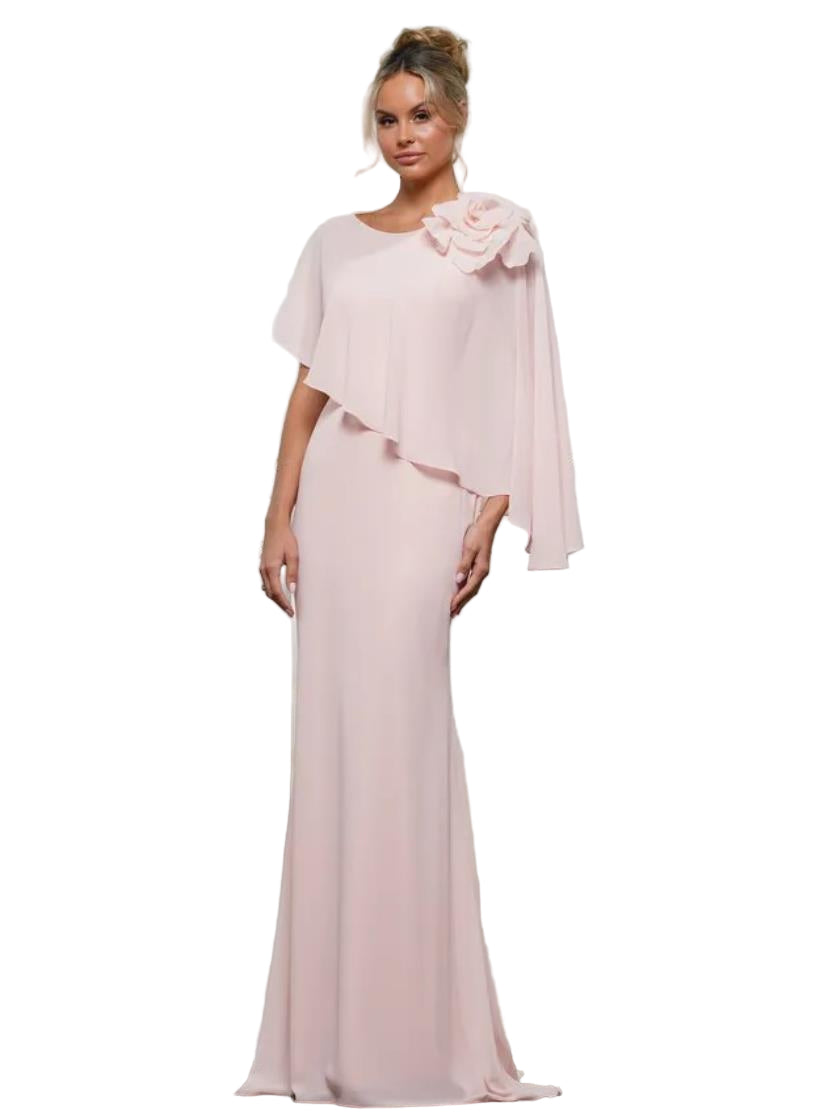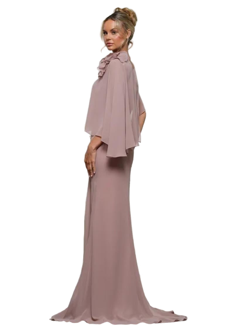 Made from luxurious stretch mikado, the fabric has a soft, reflective sheen that creates a smooth, elegant finish. A standout feature of this dress is the delicate 3D floral embellishments that cascade along the side from the shoulder to the hip, adding texture and dimension. The flowers are crafted from fabric, giving them a soft, ethereal quality that enhances the overall romantic vibe of the dress. The structured bodice is further enhanced with subtle detailing that adds depth to the design.