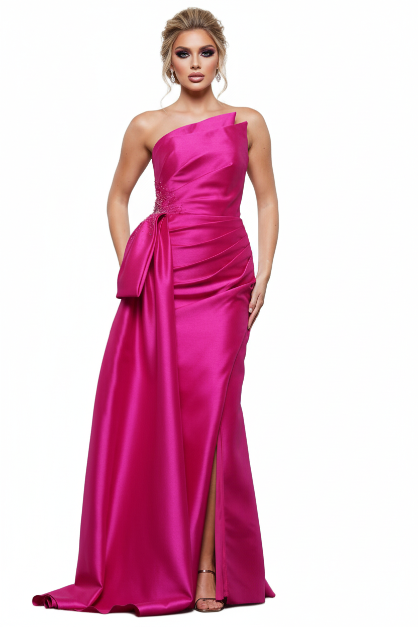 Regular price $799.00Timeless and elegant luxe silhouette made of stretch Mikado fabric. This piece features strapless yet supportive neckline with a fold over design. The back reveals a midrise style with a zipper closure. Semi peplum drape at the hips as a bow ascents the high slit that breaks its mermaid silhouette and train.